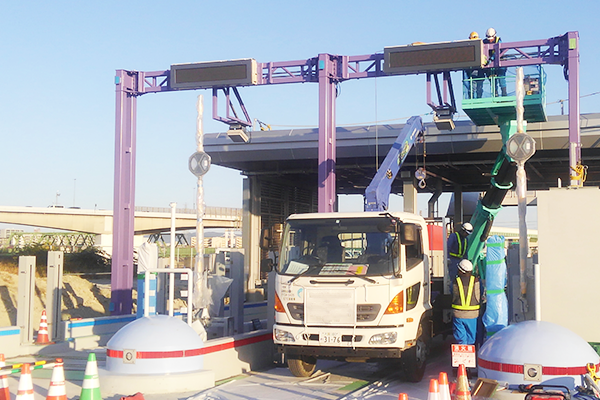 高速道路上にあるETC設備のメンテナンス・応急処置を行います。通行車両と無線通信で決済できる現代社会インフラを支えるには欠かせない設備の工事になります。