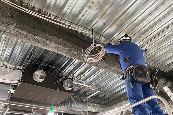 内線工事は建物内の電気の配線・配管、照明器具取付等の工事をいいます。事務所のコンセントの取り付けや工場のLED化工事など屋内の様々な電気工事を行います。